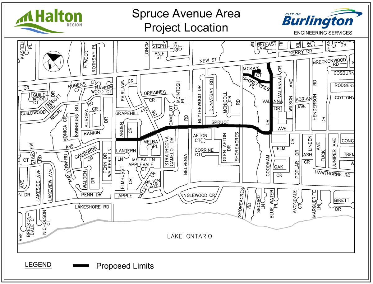 The City of Burlington and Halton Region will be making improvements in the Spruce Avenue area in 2026. The scope of work will include Spruce Avenue, Goodram Drive, Shoreacres Place, and Mackay Court. City works include asphalt rehabilitation, curb, sidewalk and storm sewer repairs, and streetlight improvements. Halton Region works include watermain replacement on Spruce Avenue.